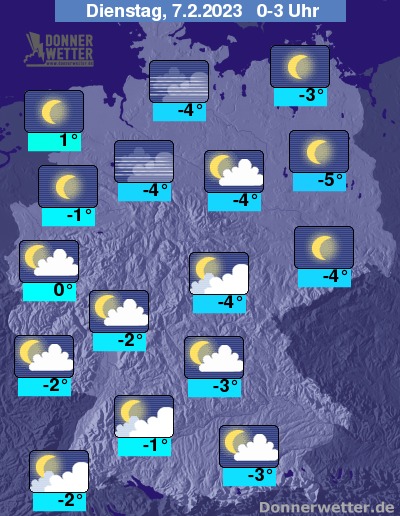 Die Temperaturen gehen in den frühen Morgenstunden im Flachland auf Werte um 0 bis -6 Grad zurück. In den südlichen und östlichen Mittelgebirgen sinken die Temperaturen in der Nacht auch teils unter die -10-Grad-Marke.