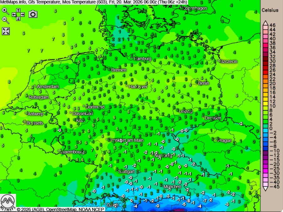 Die Temperatur- und Wetterkarte sowie die Temperaturabweichung (06:00 Uhr) nach GFS: