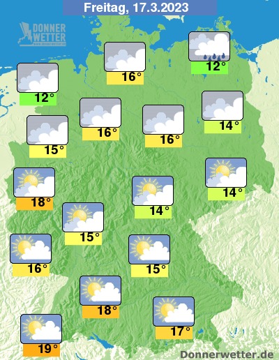 Am Freitag zeigt sich der Süden zumeist heiter bis sonnig. Dagegen bleibt es über der Nordhälfte der Bundesrepublik überwiegend dicht bewölkt. Bei Höchstwerten von 12 Grad an der See und bis 19 Grad im Breisgau bleibt es landesweit trocken.