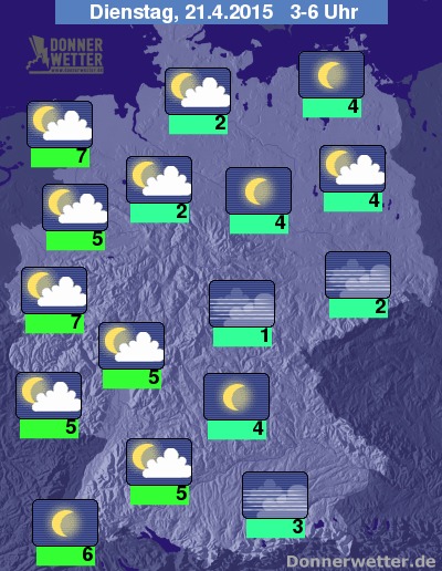 In der kommenden Nacht ziehen oft lockere Wolken durch, gebietsweise ist es aber auch wolkenlos. Es bildet sich stellenweise Nebel oder Hochnebel. Die Temperatur sinkt auf 7 Grad in Ostfriesland und bis 1 Grad im Coburger Land.