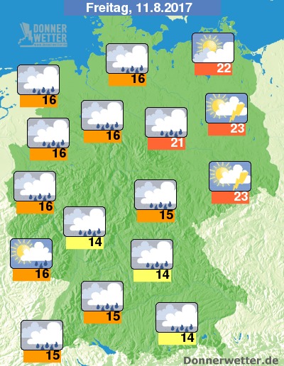 Die Wolken bleiben in der Überzahl und gebietsweise fällt teils kräftiger Regen. Im Nordosten können sich auch Gewitter entladen. Die größten trockenen Abschnitte scheint es im Rheinland, sowie an den Küsten von Nord- und Ostsee zu geben. Größere Aufheiterungsphasen sind jedoch eher selten. Die Höchsttemperaturen liegen bei kühlen 13 bis 17 Grad in Gebieten mit längerem Regen, sonst werden es zwischen 17 und 22 Grad. In der Uckermark können nochmals sommerliche 26 Grad erreicht werden. Der Wind kann im Tagesverlauf gebietsweise auffrischen.