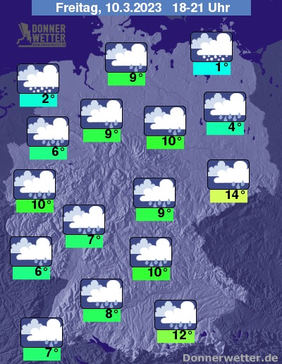 In der Nacht zum Samstag lockert es in den westlichen Landesteilen oft wieder auf, sonst halten sich noch dichte Wolken und vor allem bis Mitternacht fällt häufig Schnee, anfangs auch noch Schneeregen. Zum Morgen hin fällt lediglich an den Alpen noch gebietsweise Schnee. Die Temperatur sinkt auf 2 Grad in Dresden und bis -4 Grad in Meppen.