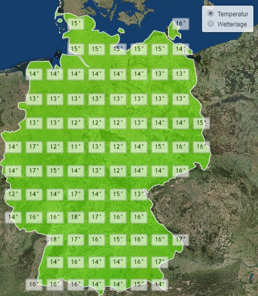 Die Temperaturen gehen dabei verbreitet zurück auf Tiefstwerte zwischen 10 und 15 Grad, etwas milder bleibt es mit bis zu 18 Grad entlang von Rhein und Donau.