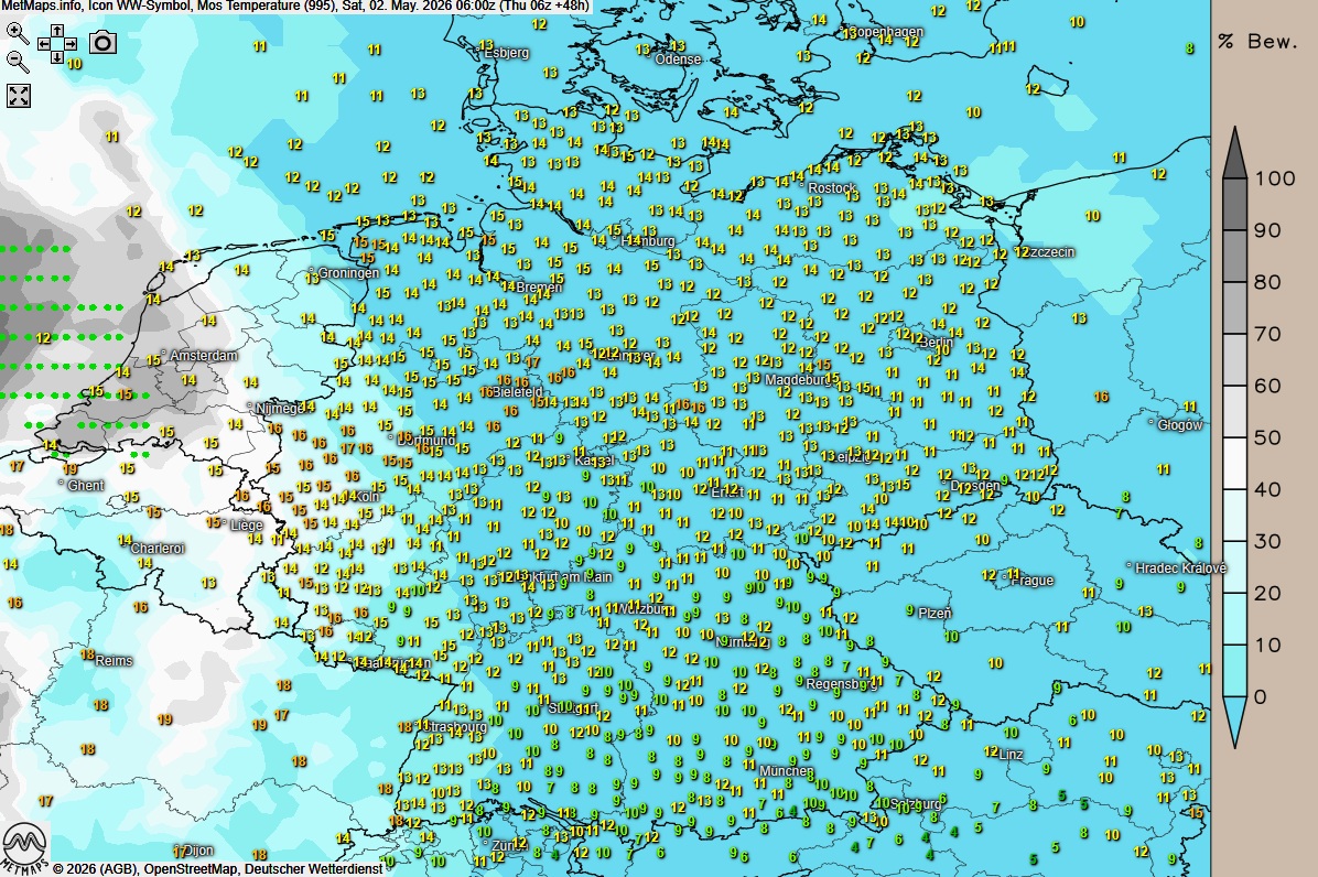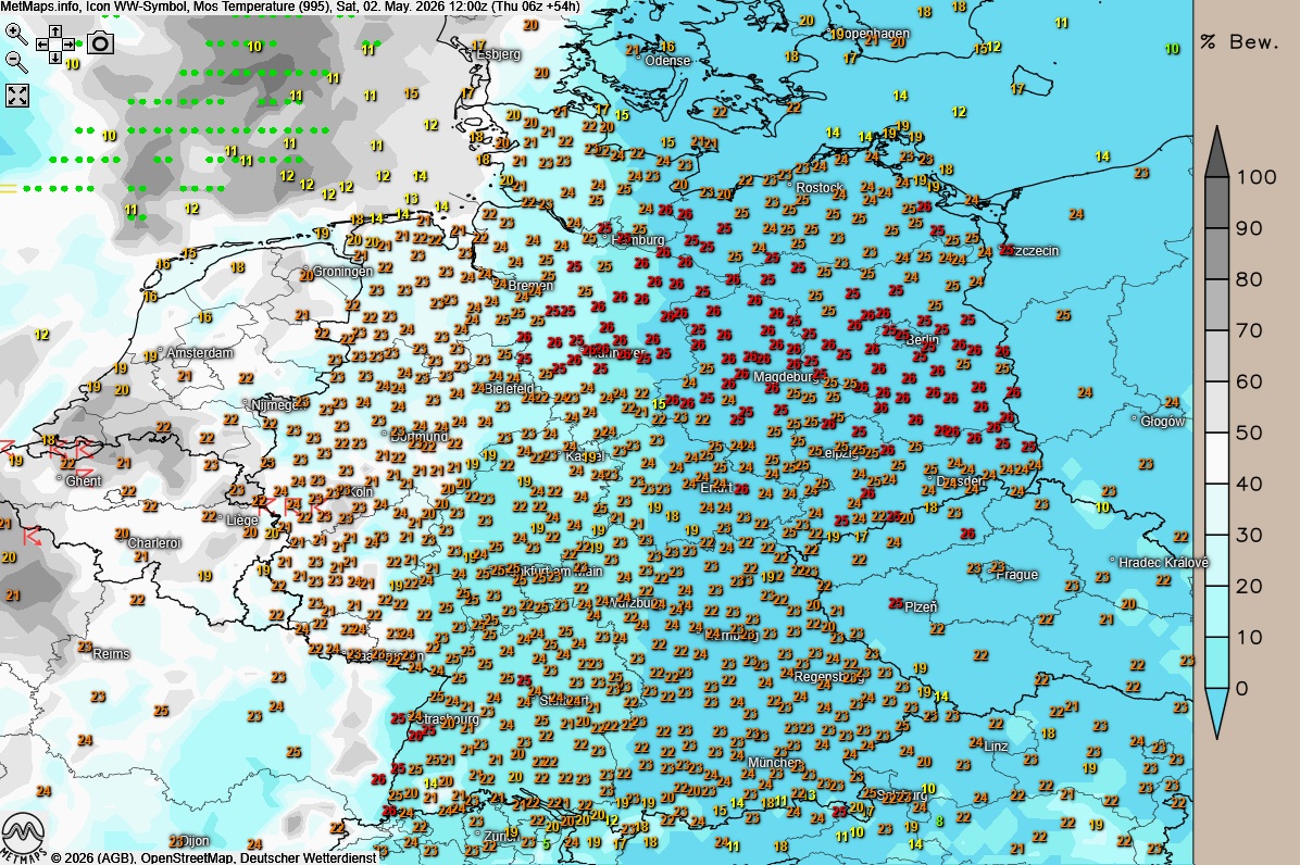 Im Tagesverlauf nimmt in der Westhälfte die Bewölkung zu. Ab dem Nachmittag wird es dann spannend: Im Westen und im äußersten Südwesten ziehen örtlich teils kräftige Schauer und einzelne Gewitter auf, die das Ende der stabilen Wetterphase markieren.