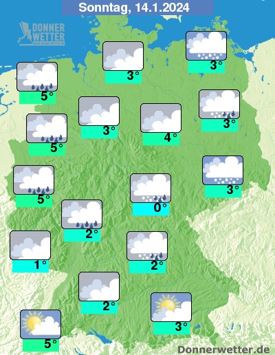 Am Sonntag zeigt sich der Himmel von Südbaden bis ins Alpenvorland heiter oder es ist sonnig. In den übrigen Landesteilen bleibt der Himmel heute stark bewölkt oder es ist bedeckt und immer wieder muss mit leichtem Regen oder Schneeregen, in höheren Lagen sowie von der Ostseeküste bis ins Vogtland auch mit Schnee gerechnet werden.