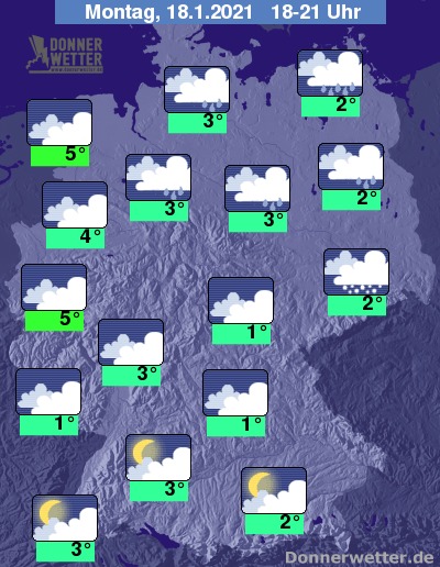 Am Montagabend bleibt der Himmel über weiten Landesteilen bedeckt, gebietsweise Auflockerungen beschränken sich vor allem auf den äußersten Süden und Südwesten Deutschlands. Im Norden und Osten muss in den Abendstunden zeitweise mit Regen-, in Mittelgebirgslagen auch Schneeschauern gerechnet werden; in den übrigen Landesteilen bleibt es meist trocken. Es bleibt speziell im Norden bei einem mäßigen bis frischen, auf den Gipfeln und an der See auch stürmischen Südwestwind.