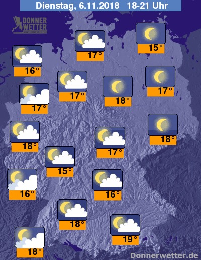 Am Abend präsentiert sich der Himmel über Deutschland meistens heiter oder nur von Wolkenschleiern überzogen. Es bleibt trocken. Die Temperaturen liegen vor der Dämmerung noch bei sehr milden 14 bis 19 Grad.