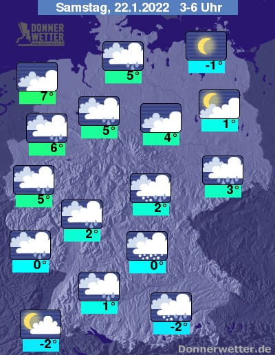 In der Nacht zum Samstag liegt das Land meist unter einer geschlossenen Wolkendecke, lediglich im Nordosten ist es oft sternenklar, im Osten oft aufgelockert bewölkt, hier bleibt es auch trocken. Im übrigen Bundesgebiet fällt verbreitet Regen, im Süden fällt zum Großteil Schnee oder Schneeregen. Die Temperatur sinkt auf 7 Grad in Emden und bis -2 Grad in München.