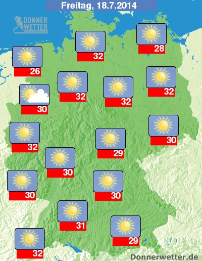 Der morgigen Freitag praktisch überall ein perfekter Sommertag mit verbreitet rund 15 Sonnenstunden. Neben sehr viel blau können am Himmel nur hier und da lockere Quellwolken stören, sonst bleibt es, bei 26 Grad an der Nordsee und verbreitet 32 Grad in Berlin-Brandenburg, sowie im Oberrheingraben und in der Kölner Bucht, überall trocken.