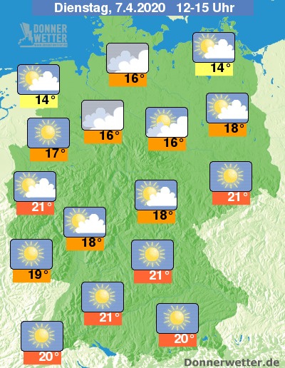 Die Temperaturen bewegen sich im Norden und über der Mitte meist zwischen 14 und 20 Grad, am kühlsten bleibt es an den Küsten von Nord- und Ostsee. Im Süden und Westen, sowie in Teilen von Sachsen wird die 20 Grad - Marke überschritten.