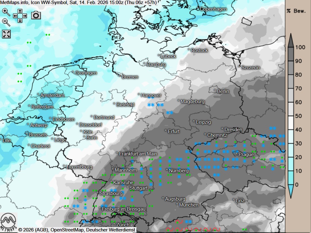 Am Samstagnachmittag zeigt sich der Himmel über weiten Teilen des Landes stark bewölkt, dabei fällt vor allem im Süden Regen, teils auch in Schnee bis in tiefe Lagen übergehend. Vor allem im Norden und Westen können die Wolken am Nachmittag zeit- und gebietsweise auflockern.