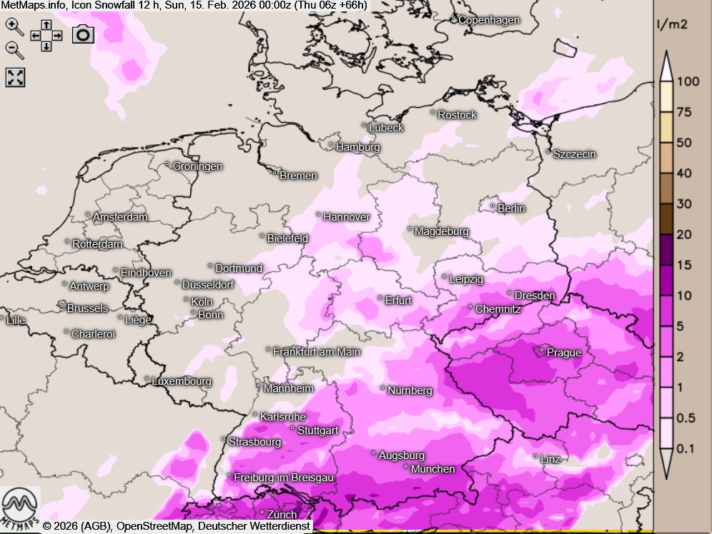 Die Wetterkarte sowie die Temperaturen / Temperaturanomalie um 15:00 Uhr und die 12-Stunden-Schneemengen bis Sonntag 00:00 Uhr nach ICON:
