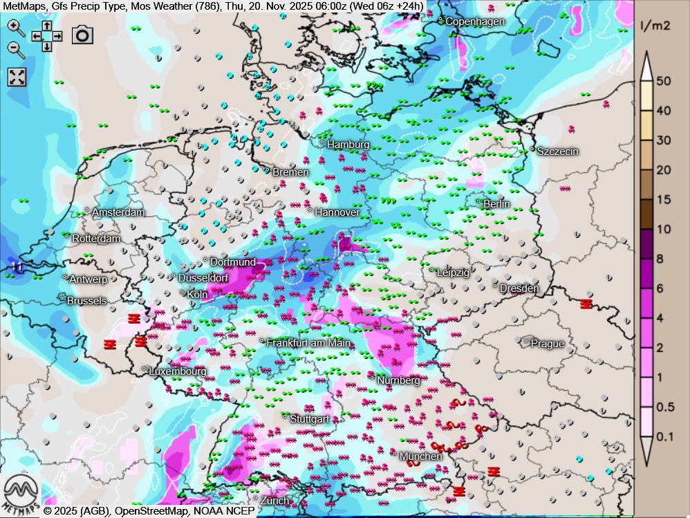 Die Strömungs- / Temperaturkarte sowie die Niederschlagskarte mit Schneeschauern (rosa) für 06:00 Uhr nach GFS:
