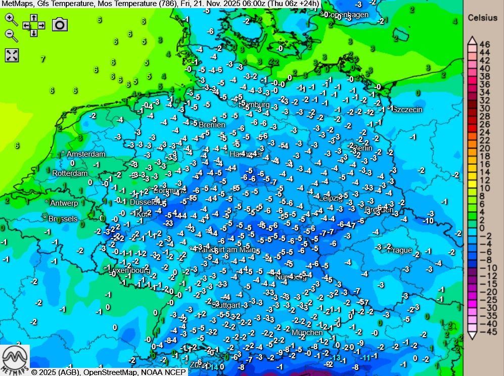 Die Temperatur- und Wetterkarte für Freitagfrüh (06:00 Uhr) sowie die 24-Stunden-Niederschlagsmengen für Freitag nach GFS: