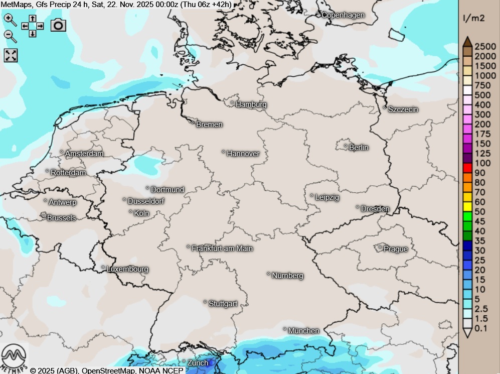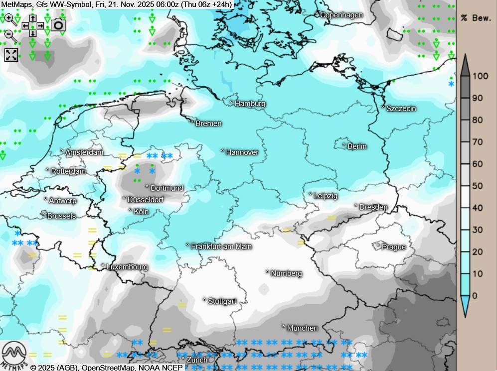Am Freitag zeigt sich der Himmel über dem Süden stark bewölkt, dabei muss zeit- und gebietsweise mit Schneefall gerechnet werden. Auch an den Küsten sind einzelne Schneeregen- oder Regenschauer möglich. In den übrigen Landesteilen überwiegt am Freitag heiteres bis wolkiges Novemberwetter und es bleibt weitgehend trocken.