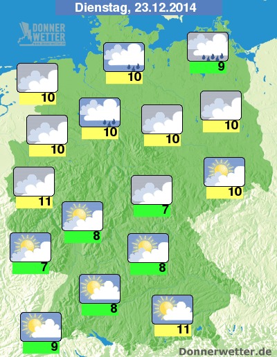 Heute kann sich südlich der Donau, nach örtlicher Nebelauflösung, häufig die Sonne zeigen, dazu bleibt es hier tagsüber auch trocken. In den nördlicheren Landesteilen bleibt es dagegen weitgehend bedeckt und im Norden fällt dabei auch zeitweise Regen, sonst bleibt es zumeist trocken. Von der breiten Mitte bis ins nördliche Deutschland weht weiterhin ein frischer und teils starker, an der See und in Böen auch ein teils stürmischer Wind. Die Temperatur steigt auf 7 Grad im Grabfeld und bis 11 Grad in Köln.