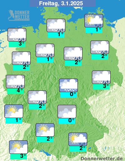 Heute zieht häufig starke, gebietsweise aber auch wechselnde bis aufgelockerte Bewölkung durch, dabei bilden sich zeitweise Schnee- oder Schneeregenschauer. Die Höchstwerte erreichen 0 Grad in Mittelfranken und bis 4 Grad im Rheinland. Über der Nordhälfte Deutschland weht ein starker und teils stürmischer Wind.