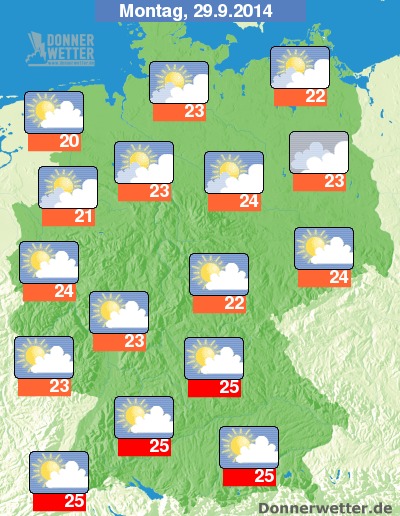 Heute bringt uns Hochdruckeinfluss wiederum freundliches und ruhiges Spätsommerwetter. Gebietsweise können auch mal dichtere Wolken durchziehen, zumeist bleibt es aber aufgelockert bewölkt oder sogar heiter und die Sonne kann sich häufig zeigen. Dazu wird es zumindest im Süden noch einmal sommerlich warm mit Temperaturen um 25 Grad, aber auch sonst steigen die Temperaturen auf spätsommerliche Werte zwischen 20 und 24 Grad.