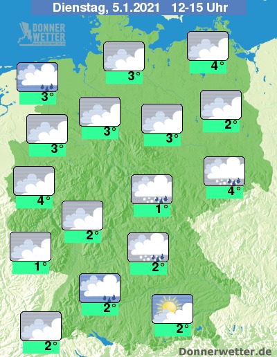 Am Dienstagnachmittag bleibt der Himmel über weiten Teilen des Landes bedeckt, einzelne Auflockerungen beschränken sich in den kommenden Stunden auf das Alpenvorland. Mit Niederschlägen, in die in den Mittelgebirgen auch als Schnee fallen können, muss vor allem in der Süd- und Osthälfte gerechnet werden. Im Küstenumfeld fallen einzelne Schauer meist als Regen oder Schneeregen.