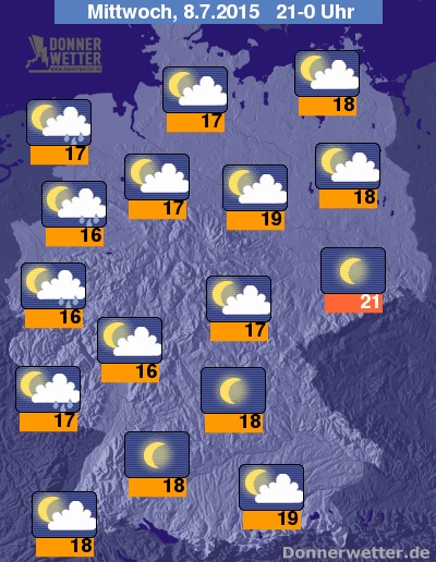 In der Nacht zum Donnerstag zeigt sich der Himmel wechselnd bewölkt, vor allem im Süden ist es auch oft nur gering bewölkt und dazu trocken, sonst zieht jedoch auch immer wieder auch starke Bewölkung durch und hier und da sind einzelne Schauer möglich, zumeist bleibt es aber trocken. Die Temperatur sinkt auf milde 15 Grad in Dresden und bis 10 Grad im Münsterland.