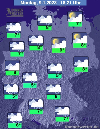 In der Nacht zum Dienstag ziehen viele und überwiegend auch dichte Wolken durch, am ehesten kann es im Westen und Nordwesten gebietsweise auflockern, hier bleibt es auch weitgehend trocken. Im Süden fällt zeitweise Regen, Schneeregen oder Schnee, sonst fällt nur selten etwas Regen. Die Temperatur sinkt auf 6 Grad in Hannover und 3 Grad in München.