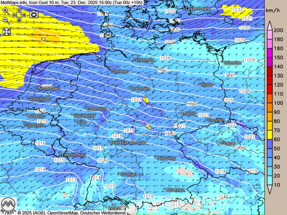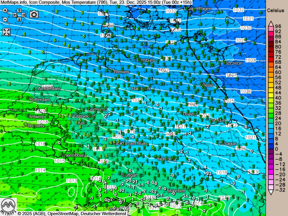 Die Strömungs- / Temperatur- und Böenkarte sowie die Temperaturabweichung in 1.500 m Höhe (Europa) für Dienstagnachmittag (15:00 Uhr) nach ICON: