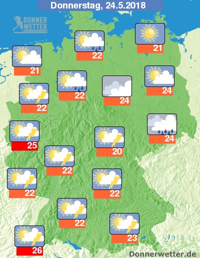 Bei vielen Wolken von Süden bis in die Mitte ausgreifende Schauer und Gewitter, örtlich auch mit heftigem Starkregen und Hagel. Im Norden und Nordosten häufig heiter bis sonnig und trocken. Höchsttemperaturen 21 bis 24, im Norden bis 27, an der Ostsee und im Bergland 17 bis 23 Grad. Von Gewitterböen abgesehen schwacher bis mäßiger, nach Norden hin zeitweise böig auffrischender Nordostwind.