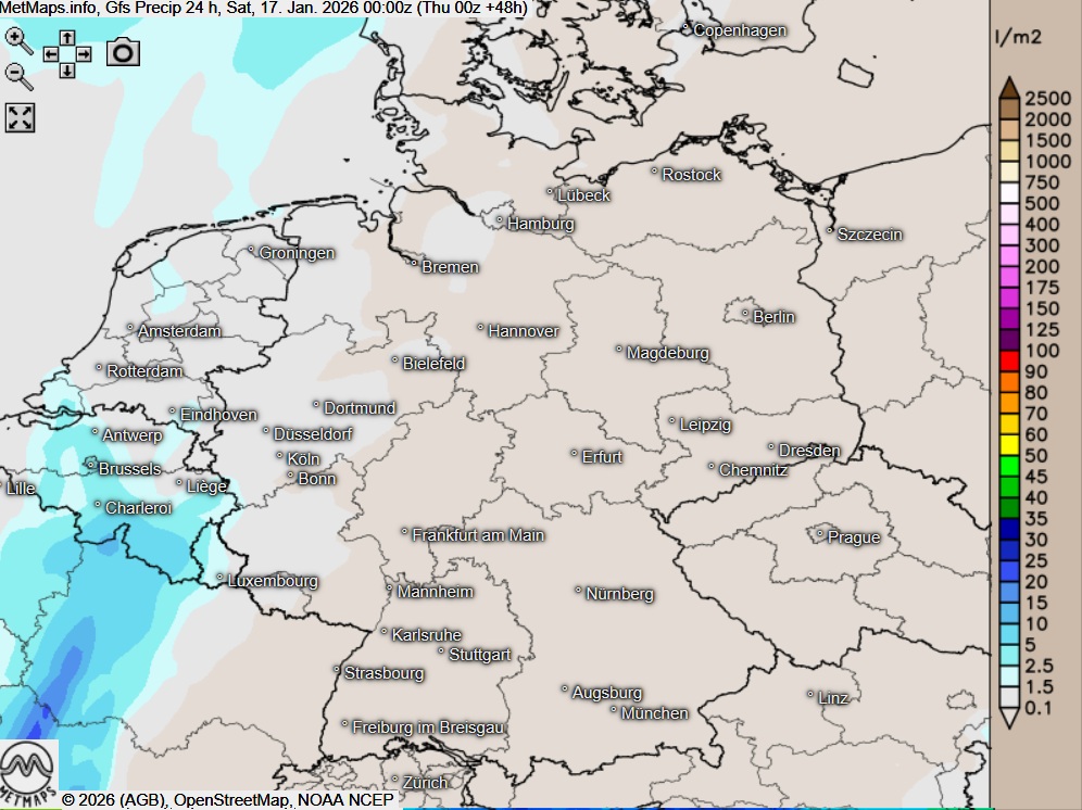 Die Lufttemperatur- und Böenkarte für Freitagfrüh (06:00 Uhr) sowie die 24-Stunden-Regenmengen nach GFS: