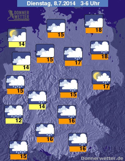 In der Nacht bleibt der Himmel weitgehend bedeckt und es fällt immer wieder, teils gewittriger Regen. Trocken bleibt es überwiegend im Nord- und Ostseeumfeld. Die Temperatur sinkt auf milde 18 Grad in Berlin und kühlere 12 Grad im Pfälzer Wald.