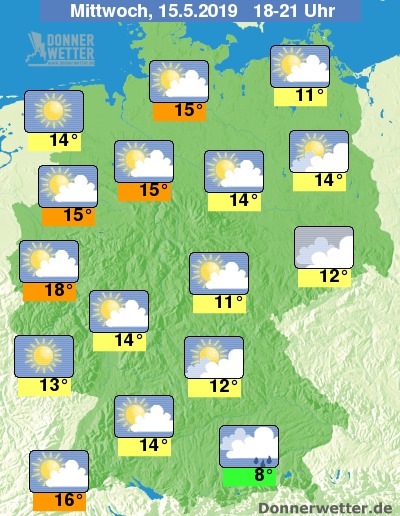 Die Temperaturen liegen am frühen Abend noch bei 8 bis 10 Grad an Isar und Inn. Sonst werden verbreitet 10 bis 16 Grad, in den Ballungsgebieten des Westen auch recht milde 18 Grad erreicht.