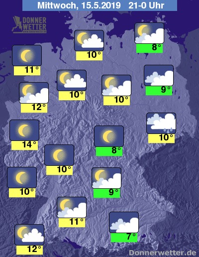 Die Luft kühlt bis zu den Frühstunden auf 5 bis 0 Grad ab, wahrscheinlich gibt es in der Landesmitte auch wieder stellenweise leichten Spätfrost. An der See, sowie unter den dichten Wolken im Nordosten bleibt es etwas milder.