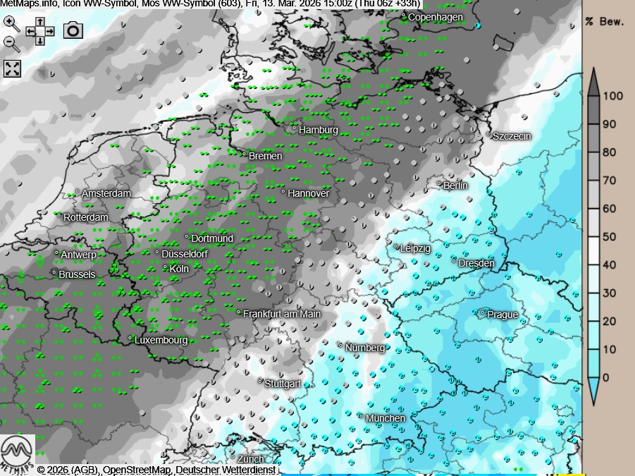 Am Freitagnachmittag zeigt sich der Himmel über dem Osten und Südisten heiter oder es ist sonnig, dabei bleibt es trocken. Sonst ist stark bewölkt oder bedeckt, dabei fällt verbreitet Regen. Der Wind schwächt am Nachmittag ab.