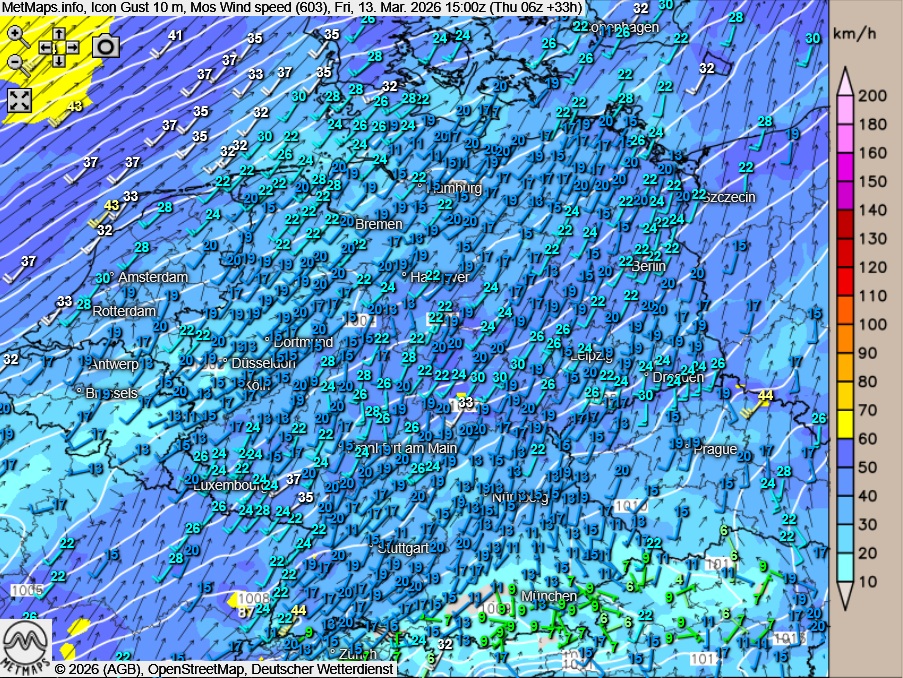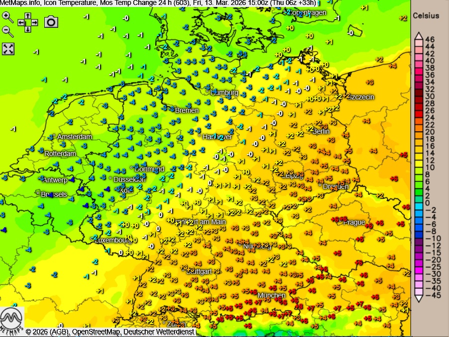 Die Wetter- und Temperaturkarte mit der 24-Stunden-Temperaturveränderung sowie die Böenkarte für 15 Uhr nach ICON: