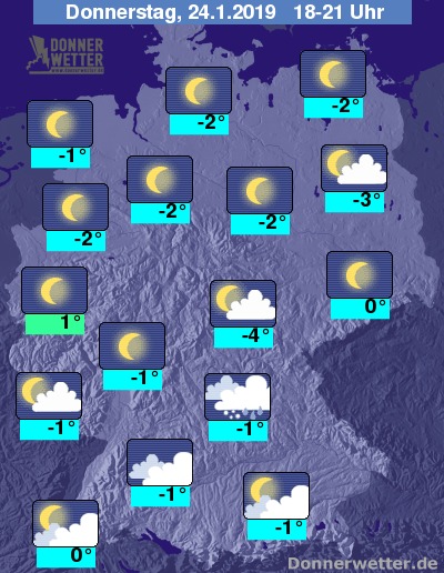 Während der zweiten Nachthälfte muss im Süden regional weiterhin mit leichtem Schneefall, oder Schneegriesel gerechnet werden, wobei die Gefahr von Glätte besteht. Sonst leuchten häufig Mond und Sterne. Nur stellenweise halten sich tiefhängende Wolken oder Nebel.