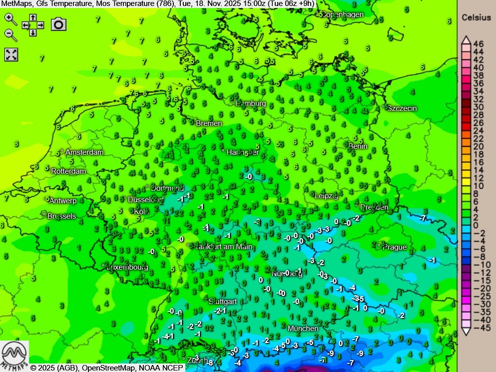 Die Lufttemperaturen sowie die Wetterkarte für Dienstagnachmittag (15:00 Uhr) nach GFS: