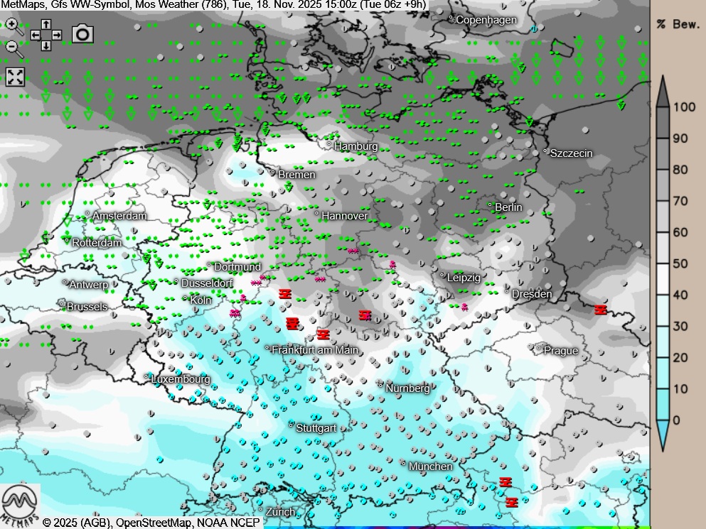 Am Dienstagnachmittag zeigt sich der Himmel über dem Norden und Westen Deutschlands meist stark bewölkt, dabei fällt in tiefen Lagen zeitweise Regen, oberhalb von 400 bis 600 m Schnee. In den übrigen Landesteilen wechseln sich am Dienstag Sonne und Wolken ab, im Süden ist es auch sonnig, und es bleibt weitgehend niederschlagsfrei.
