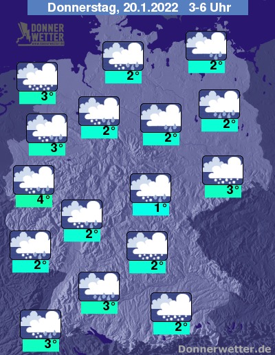 In der Nacht zum Donnerstag ziehen aus Nordwesten oft dichte Wolken durch, die immer wieder zu teils kräftigen Schnee-, Schneeregen-, Regen- oder Graupelschauern führen. Dazwischen sind Auflockerungen möglich. Die Temperatur sinkt auf 4 Grad in Köln und etwa 1 Grad in Erfurt.