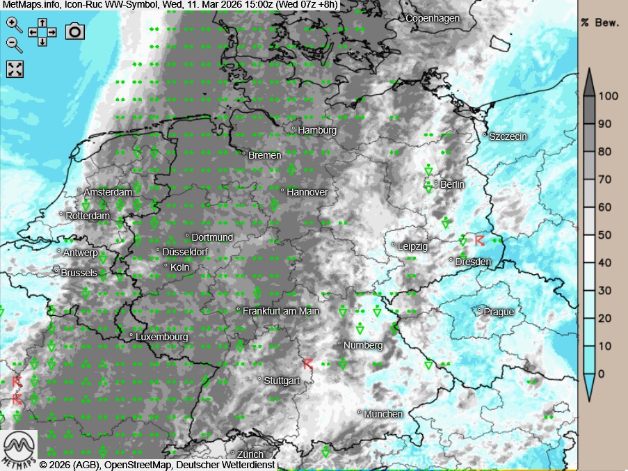 Am Mittwochnachmittag zeigt sich der Himmel über dem Norden und Westen stark bewölkt, dabei fällt verbreitet teils schauerartig verstärkter Regen. Im Süden und Osten sind einzelne Schauer und Gewitter möglich, meist bleibt es hier aber bis zum Abend niederschlagsfrei.