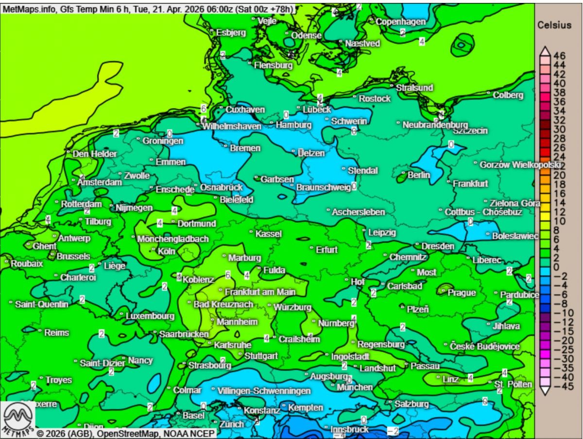 Erste Berechnungen zeigen beispielsweise für Dienstagmorgen im Nordwesten, etwa zwischen Bremen und Hamburg, Temperaturen um oder leicht unter dem Gefrierpunkt.