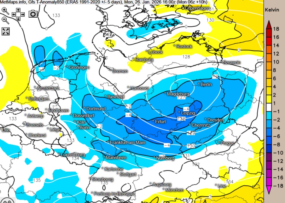 Die Wetter- / Temperaturkarte und die Temperaturabweichung für 16.00 Uhr sowie die 24-Stunden-Schneemengen am Montag nach GFS: