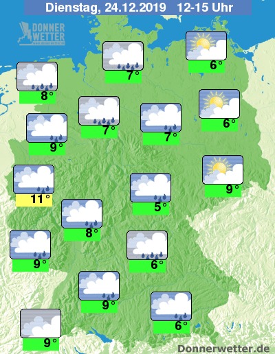 Im Laufe des Nachmittags kommt der Regen auch in den Gebieten nordöstlich der Elbe an. Dafür kann man im Westen neben örtlichen Schauern noch einige untergehende Sonnenstrahlen erhaschen. Das Christkind muss bei seiner Geschenkeverteilung auf den Schlitten verzischten.
