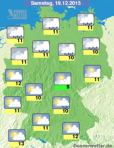 Am Samstag halten sich im Norden jedoch noch oft dichte Wolken aus denen zeitweise Regen fällt. Vor allem im Südwesten, aber auch im Süden und Westen ist es verbreitet nur locker bewölkt und teils sogar sonnig. Im übrigen Land gibt es meist einen Wechsel aus Sonne und teils dichteren Wolken, dazu bleibt es dann weitgehend trocken. Die Temperatur liegt bei 9 bis 13 Grad.