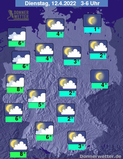 In der kommenden Nacht ziehen über die westlichen Landesteile oft dichte Wolken hinweg, teils ist es hier aber auch aufgelockert bewölkt. Weiter nach Osten hin zeigt sich der Himmel meist locker bis wechselnd bewölkt, gebietsweise ist es auch sternenklar. Es bleibt überall trocken bei Tiefstwerten von 8 Grad in Köln und etwa 1 Grad in Stralsund.