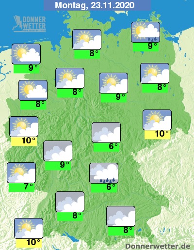 Am Montag bleibt es über der Südhälfte des Landes trüb oder stark bewölkt, dabei fällt aber kaum Regen. Im übrigen Bundesgebiet ist es meist locker bis aufgelockert bewölkt, lediglich an der See bilden sich einzelne Schauer, sonst bleibt es trocken. Die Temperatur steigt auf 6 Grad in Mittelfranken und bis 10 Grad in der Lausitz.