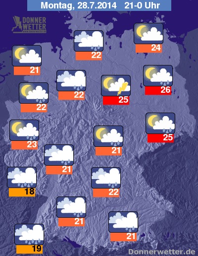 In der Nacht zum Dienstag halten sich verbreitet viele, meist auch dichte Wolken, dabei kommt es zu weiteren Schauern und Gewitter. Zwischen den Schauern und Gewittern bleibt es aber besonders im Küstenumfeld und auch in weiten Teilen Ostdeutschland über lange Zeiträume auch trocken. Die Temperatur sinkt auf 19 Grad in Dresden und 14 Grad am Pfälzer Wald.