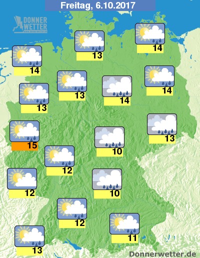 Ab Wochenmitte könnte dann ein Hochdruckgebiet vor allem im Süden und in der Mitte für freundlicheres und wärmeres Oktoberwetter sorgen. Der Norden wird gelegentlich von weiteren Störungsfronten vom Atlantik mir Regen und Schauern erfasst.