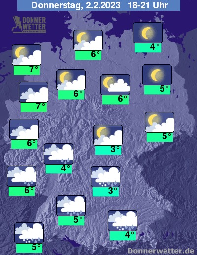 In der Nacht zum Freitag zieht zunächst im Westen und Südwesten kompakte Bewölkung und Regen, teils Schneeregen auf, der sich im Laufe der Nacht weiter nach Osten hin ausbreitet. Über Bayern und Thüringen fallen die Niederschläge zum teils auch als Schnee. Gegen Morgen ist es dann lediglich im Osten und Nordosten noch weitgehend trocken. Die Temperatur sinkt auf 7 Grad in Köln und -1 Grad in Jena.