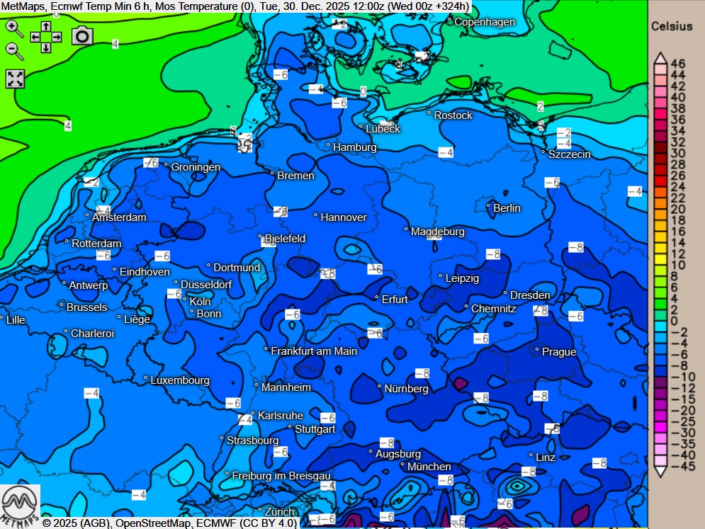 Die Temperaturabweichung Europa in 1.500 m Höhe am 25.12. (06:00 Uhr) sowie die Frühwerte am 30.12. nach ECMWF: