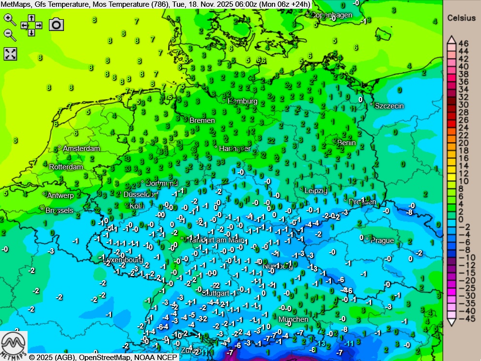 Die Lufttemperaturen Dienstagfrüh (06:00 Uhr) sowie die 24-Stunden-Regenmengen für Dienstag nach GFS: