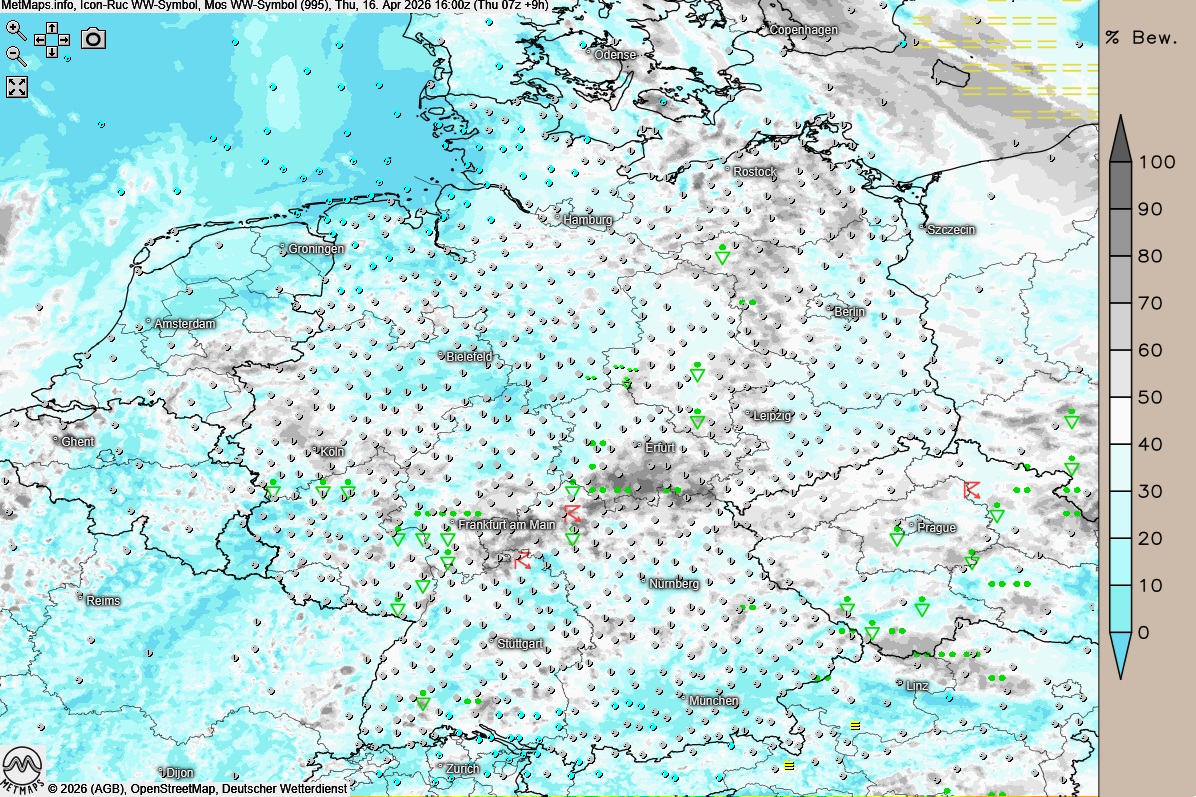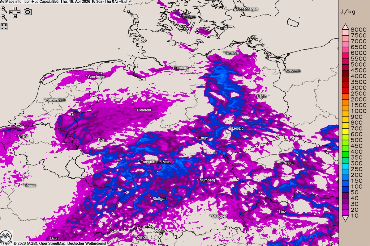 Die Wetter- und Temperaturkarte für 16:00 Uhr sowie die Cape-/Lifted-Karte (850 hPa) für 16:30 Uhr nach ICON-RUC:
